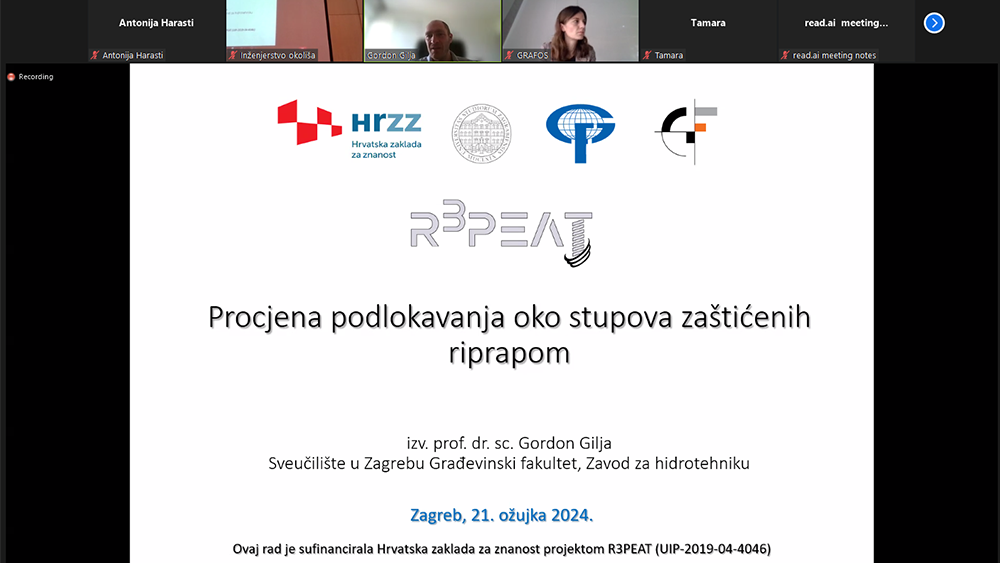 Povodom obilježavanja Svjetskog dana voda na Geotehničkom fakultetu Sveučilišta u Zagrebu u suorganizaciji s Hrvatskim hidrološkim društvom održana su pozvana predavanja s aktualnim temama. U jednoj od njih, „Procjena podlokavanja oko stupova zaštićenih riprapom“, izv. prof. dr. sc. Gordon Gilja predstavio je metodologiju praćenja podlokavanja kojom se koristi RISED laboratorij.
