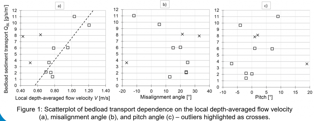 This research examined the hydraulic efficiency of the Helley-Smith bedload sediment sampler, focusing on how deviations in its orientation—particularly when it is not positioned on flat riverbed and/or aligned with the flow—affect data accuracy. Field measurements from the Danube River revealed that data collected with a sampler deviating more than 25° from the mean flow direction or exceeding a pitch/roll angle of 10° should be excluded from further analysis to ensure reliable results.