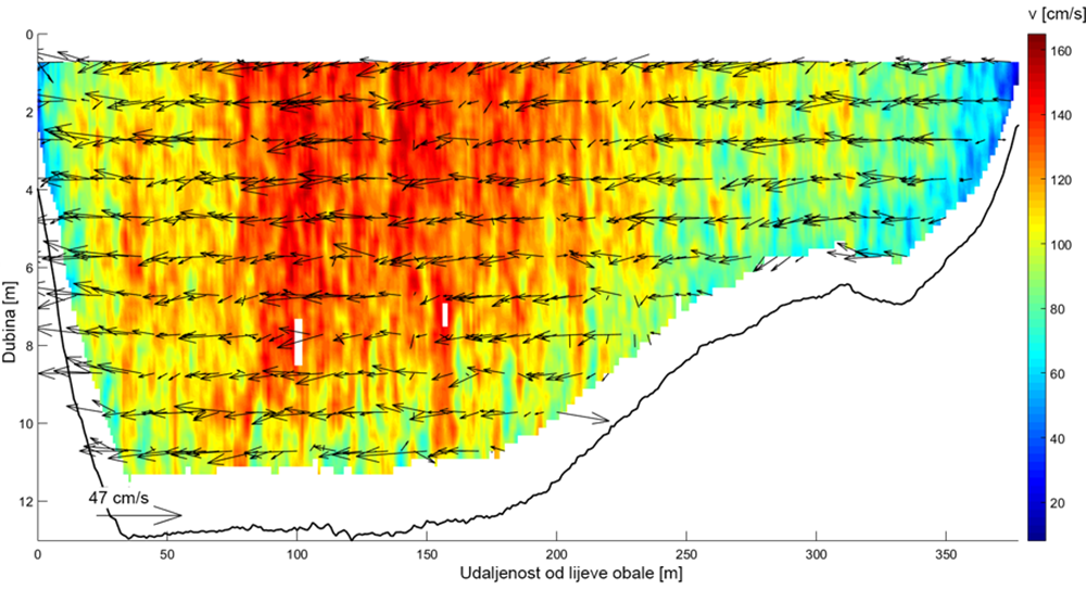 ADCP presents velocities in a grid of cells of over the entire measured cross-section in real-time.
