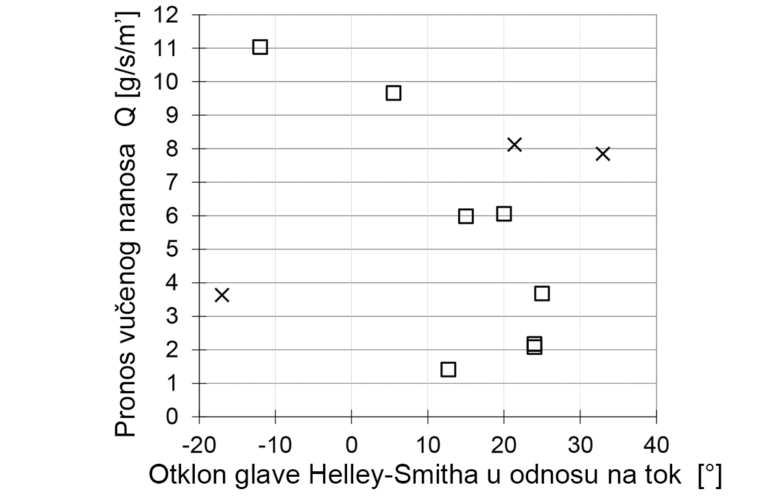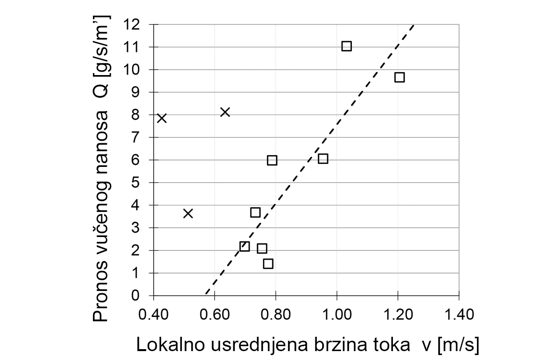Na grafici se vidi da u nekim slučajevima količina zahvaćenog nanosa ne korelira s brzinom toka na ulasku u otvor hvatača, što upućuje na grešku.